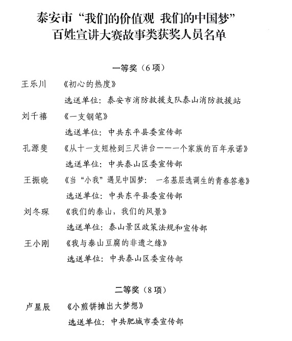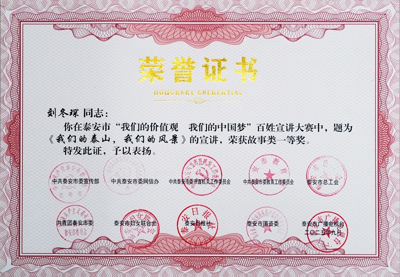 近日,中共泰安市委宣傳部等多部門(mén)聯(lián)合主辦的泰安市“我們的價(jià)值觀我們的中國(guó)夢(mèng)”百姓宣講大賽結(jié)果公布,泰山文旅集團(tuán)子公司泰山出品公司職工劉冬琛,憑借題為《我們的泰山,我們的風(fēng)景》的宣講,榮獲故事類一等獎(jiǎng)。