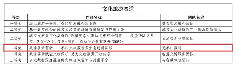 近日,由山東省大數(shù)據(jù)局、中共山東省委網絡安全和信息化委員會辦公室、共青團山東省委等多部門聯(lián)合主辦的2025年“數(shù)據(jù)要素×”大賽山東分賽圓滿落幕。泰山文旅集團子公司元泰山數(shù)字科技有限責任公司憑借“數(shù)據(jù)要素驅動——泰山文旅數(shù)智多業(yè)態(tài)創(chuàng)新實踐”項目,從眾多參賽作品中脫穎而出,獲文化旅游賽道二等獎。